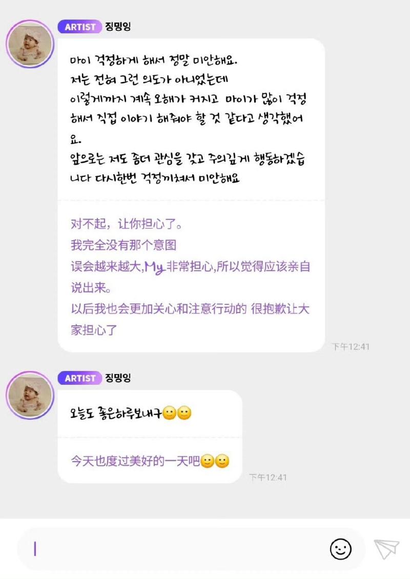 Karina表示自己不是故意選擇這件衣服,而是:「我和staff們一起出門,有點涼的天氣就買了外套穿上,為了和粉絲溝通這樣上傳了帖文,然後收到了聯系並刪除了帖文,對于這些我也覺得是我太無知了,不管我是不是在海外,那也是我應該知道的部分,所以覺得“啊我應該要增加認知,好好學習了”,我好像是太無知了,總之確實是我引起了爭議,看到成員們也被傷害,真的很辛苦。」