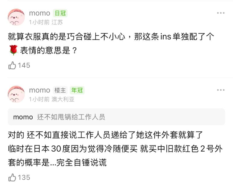 也就是說,這件引起爭議的外套,是因為天氣冷才偶然買下的嗎?對於這樣的解釋,網友顯然不買賬,因為該外套並不是最新款,偶然被買下的幾率到底有多高?來看看網友的質疑👇