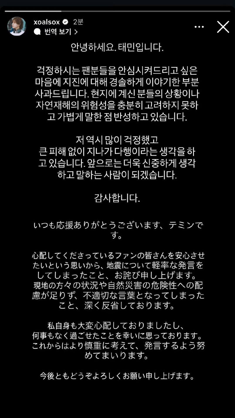 而此前和成員崔珉豪一起進行了直播的泰民,在直播中提及了這次的地震預言,表示:「如果發生了地震,我的舞台預計會更加帥氣」的言論,引起了熱議!