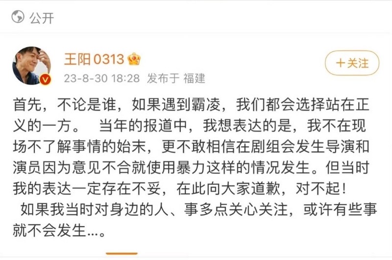 隨後有網友扒出當年同劇組的王陽,在受訪時疑似站隊施暴者!王陽在訪談中提及自己並未在現場,可他覺得導演不會心胸狹隘到因為和演員有意見分歧,就指使副導演去毆打對方。