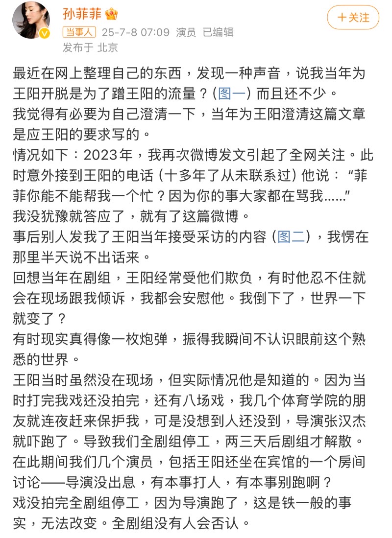 沒想到8號這天,孫菲菲再次發長文舊事重提,起因是她發現有網友解釋王陽訪問一事,說是自己蹭王陽熱度👇