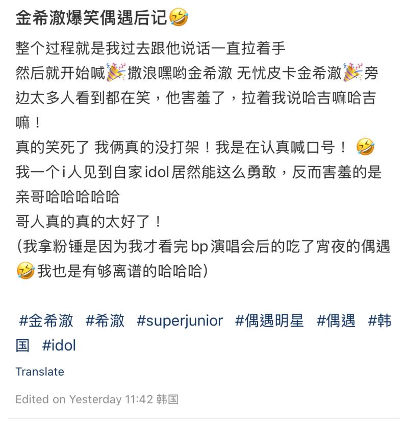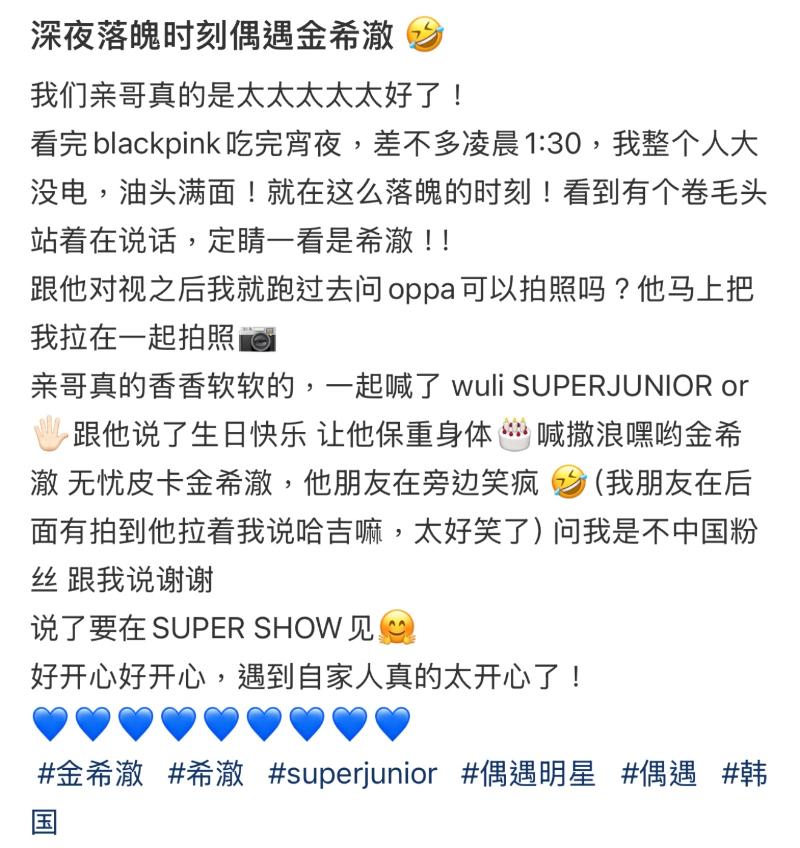 是噠,原Po分享了自己在看完BLACKPINK演唱會後,吃完宵夜渾身落魄時,居然發現了自己的偶像金希澈!最爆笑的是,原Po直接原地高喊了希大專屬口號:「撒浪嘿呦金希澈!無憂皮卡金希澈!」(我們愛你金希澈!牛奶光澤金希澈!),希澈的朋友也在一旁狂笑!