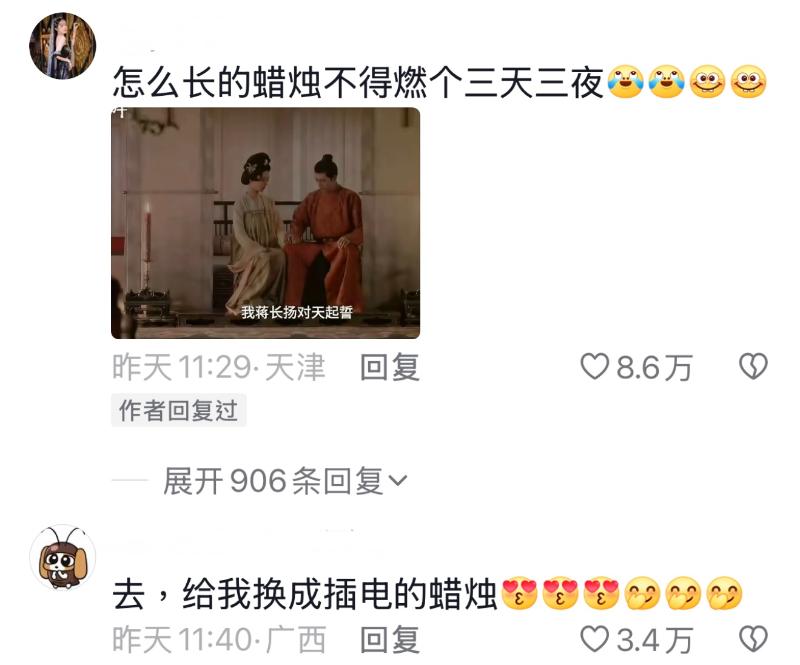 表示蔣長揚在圓房之夜的一句「花燭沒燃盡前誰都不許離屋」更是大出圈,以此暗示親密時長,被調侃“花燭長度卷出新高度“,讓觀眾直呼虎狼之詞也太猛!