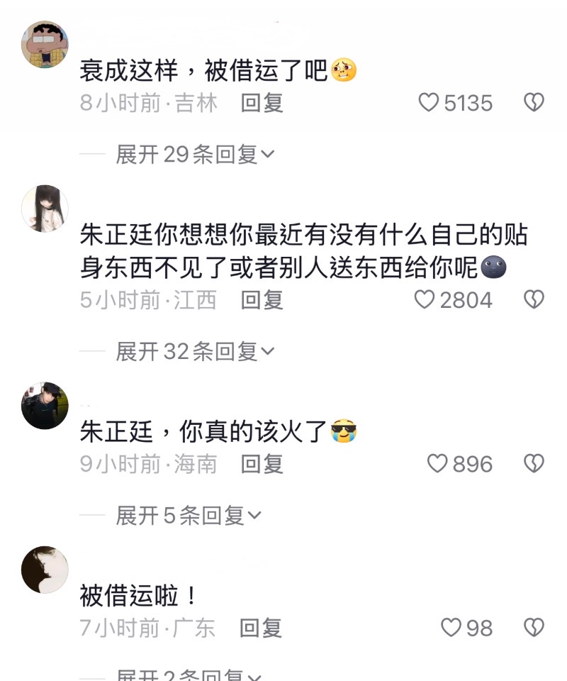 這段視頻播出之後,粉絲都心疼人怎麼可以倒霉成這樣,但也有不少網友紛紛提醒朱正廷有關「借運說」👇
