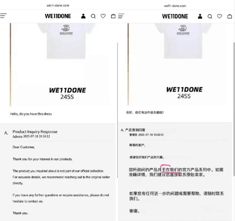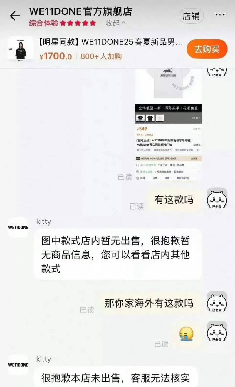 雖然但是,隨著爭議,網友扒出中國「WE11DONE」官方店回應品牌並沒有這一款👇