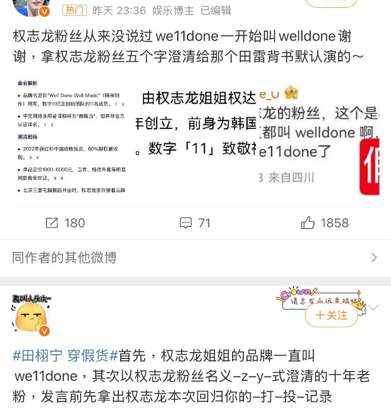 這麼看來,真的一直都是「WE11DONE」啊~目前田栩寧方並沒有回應,但可以讓王嘉爾和權志龍粉絲出來維權,也是“很有能力”啊!