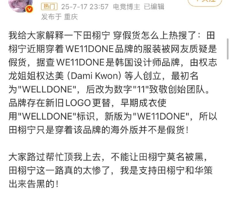 這麼看來,真的一直都是「WE11DONE」啊~目前田栩寧方並沒有回應,但可以讓王嘉爾和權志龍粉絲出來維權,也是“很有能力”啊!