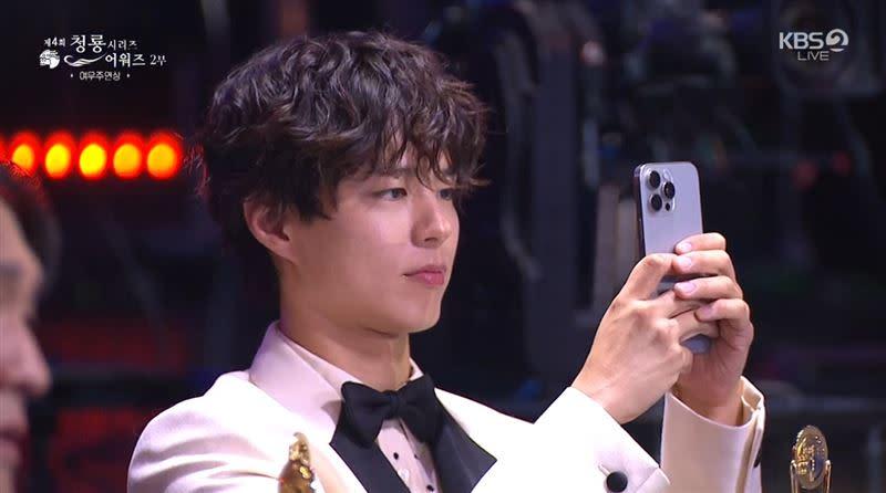而在劇中和她合作的男主角朴寶劍,則拍下了IU致詞全程,絕對是最前線的迷弟啊!