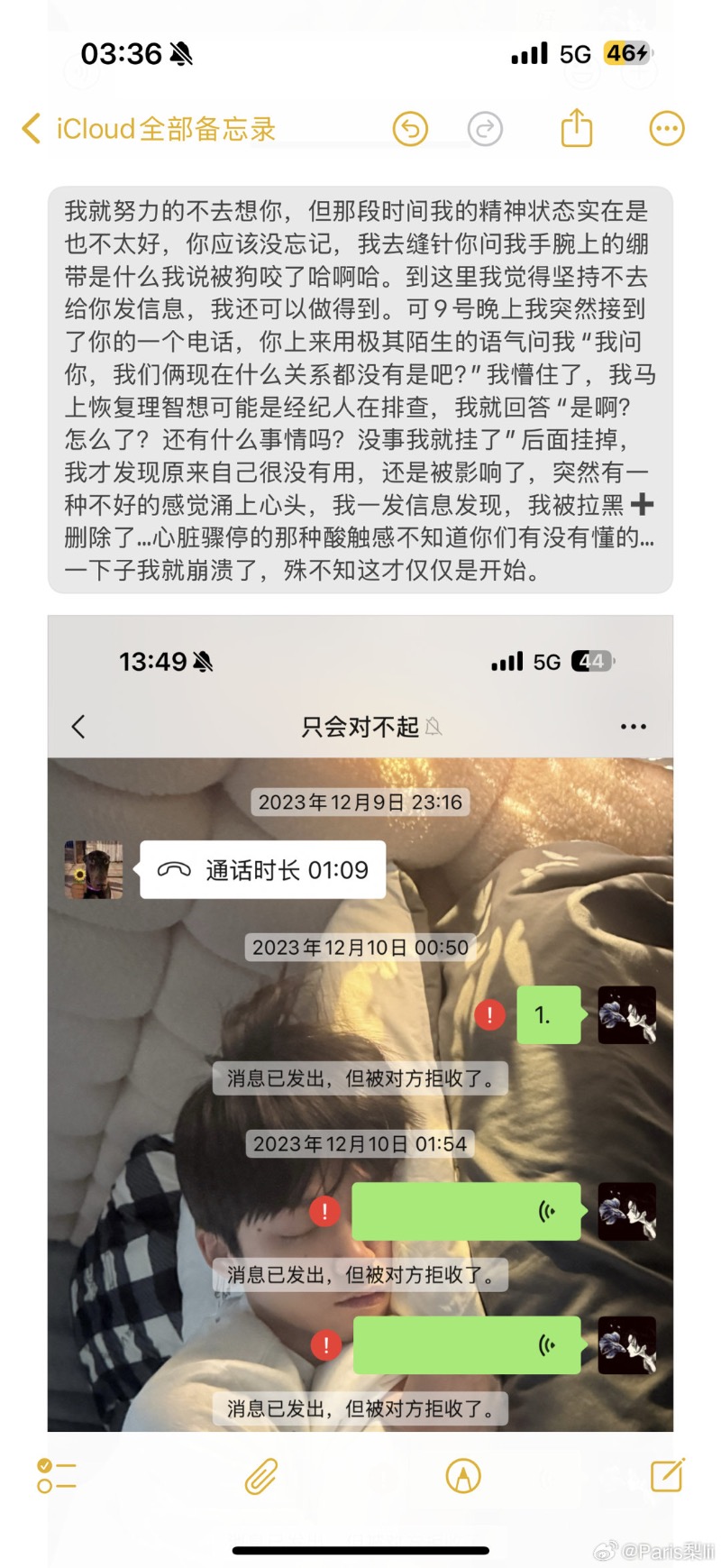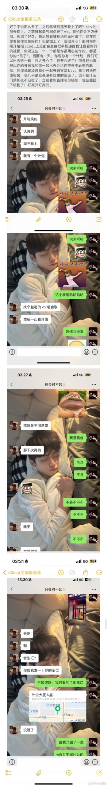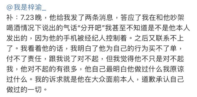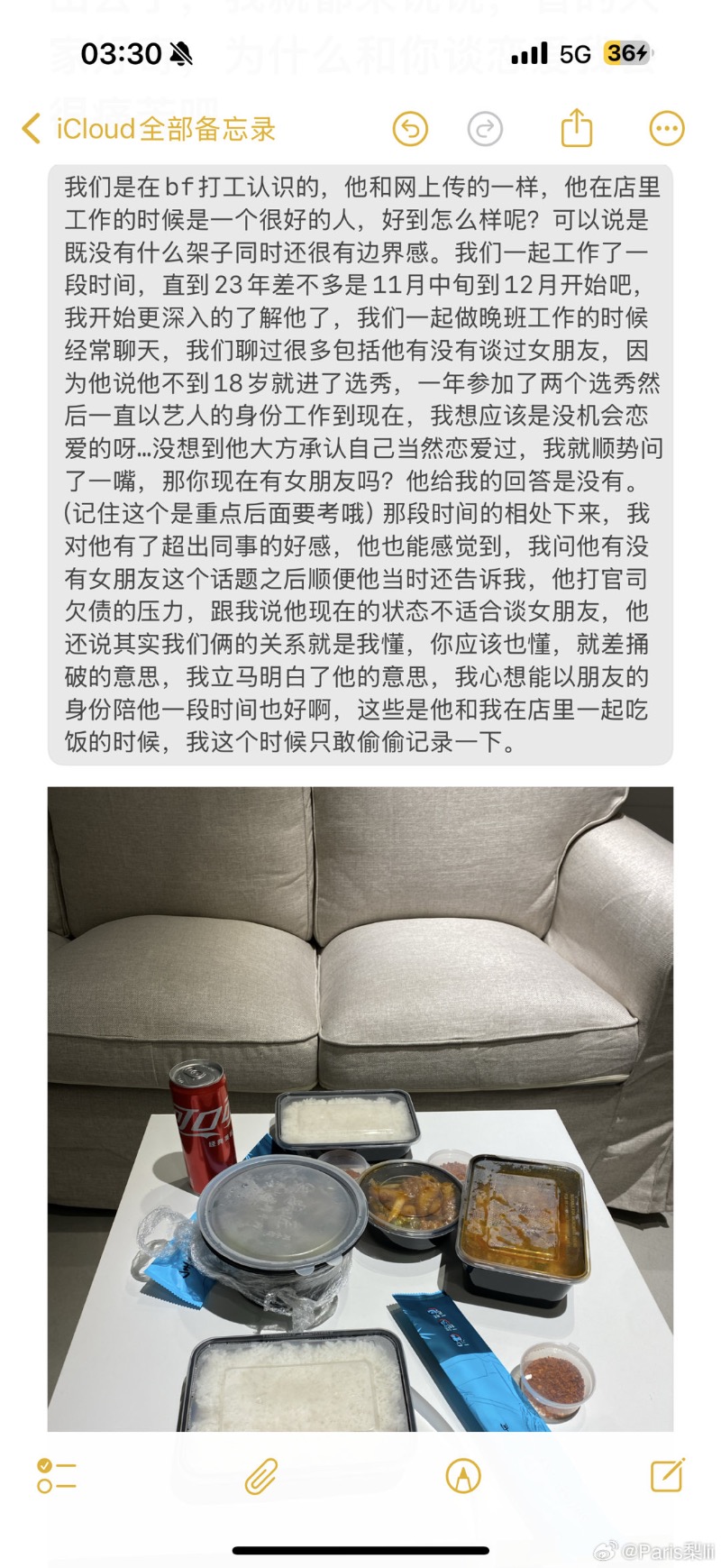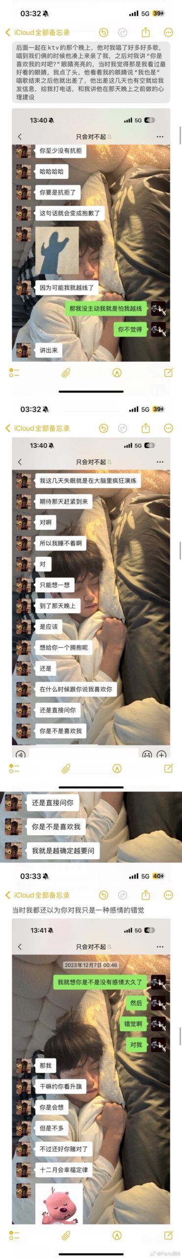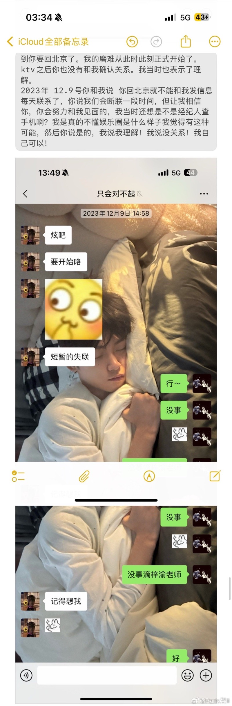 女方自稱2023年11月與梓渝在服裝品牌BF北京店鋪打工時相識。梓渝主動否認有女友,並以「打官司欠債、不適合戀愛」為由維持暧昧關系,但于12月KTV約會中主動親吻女方並表白。2023年12月9日,梓渝以「經紀人查手機」為由斷聯,隨即拉黑女方所有聯系方式。後坦白當時的經紀人實為交往兩年的女友,因對方「以死相逼」無法分手。
