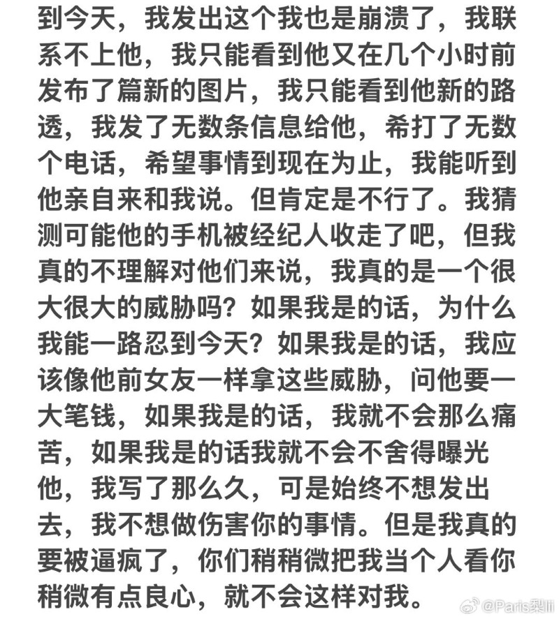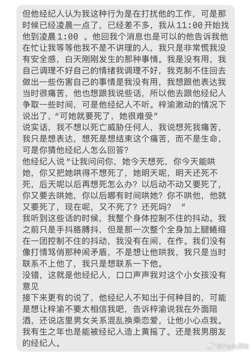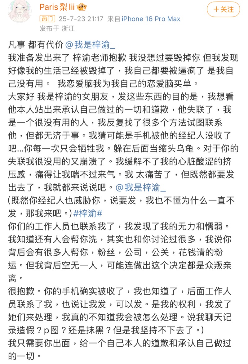 沒想到23號深夜,一名自稱是梓渝女友的網友發長文,公開了自己和梓渝的戀情,並曝出自己被小三,還有梓渝的前女友是他的經紀人等炸裂消息!
