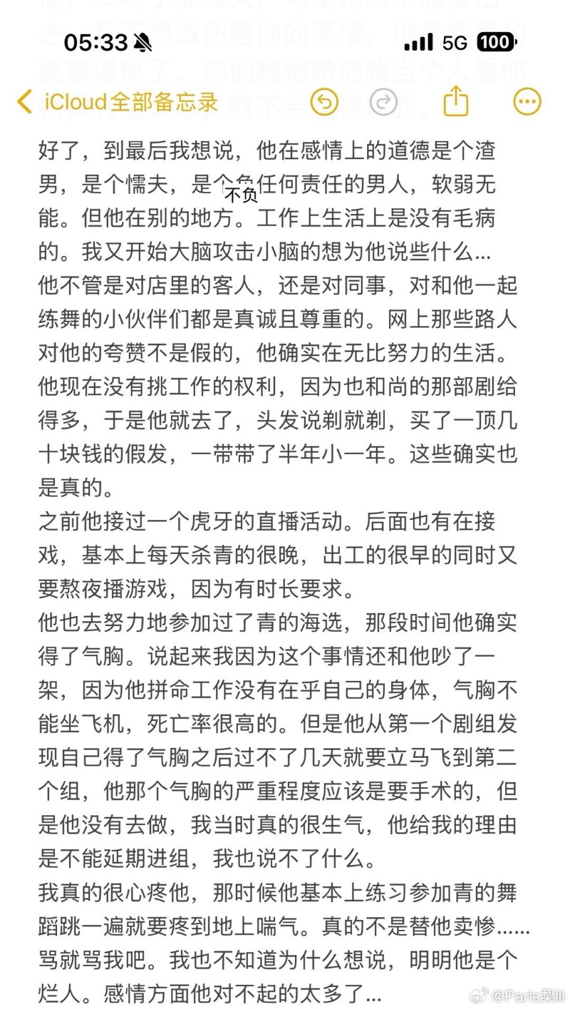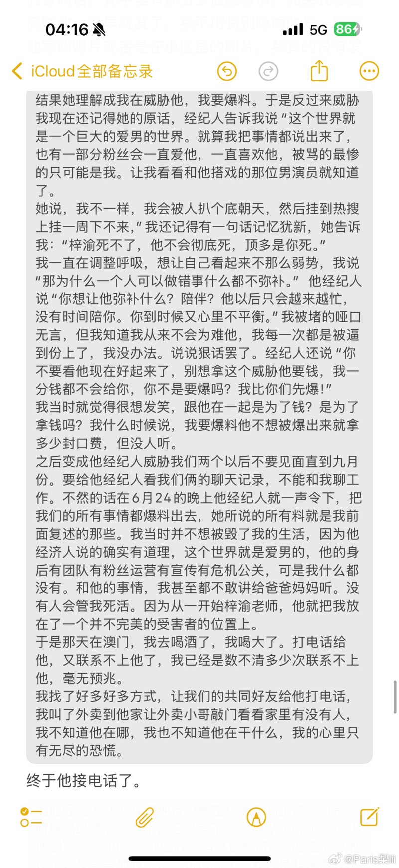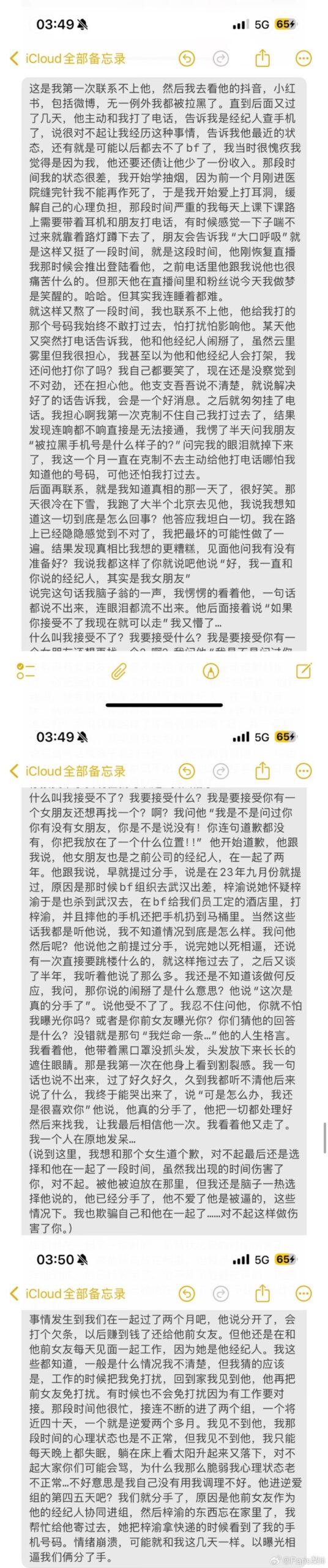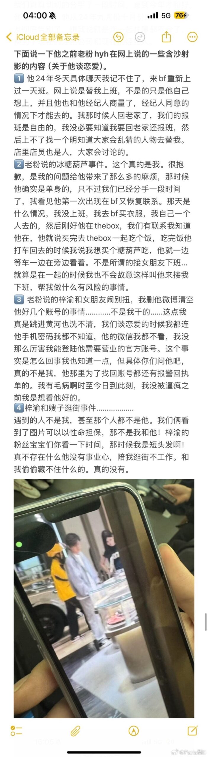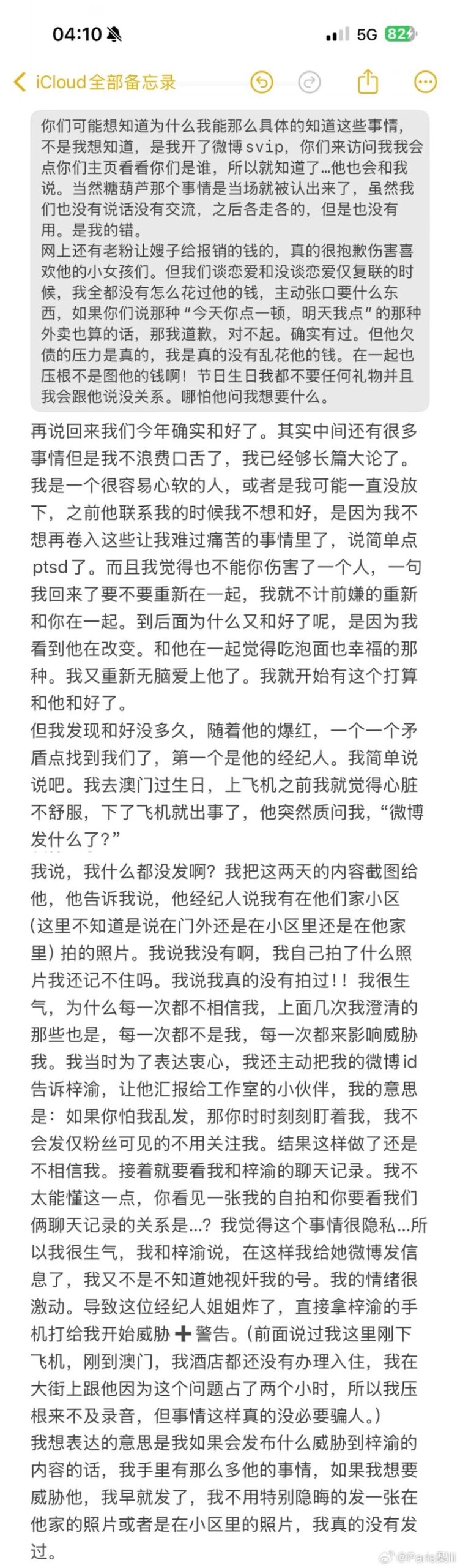 女方自稱2023年11月與梓渝在服裝品牌BF北京店鋪打工時相識。梓渝主動否認有女友,並以「打官司欠債、不適合戀愛」為由維持暧昧關系,但于12月KTV約會中主動親吻女方並表白。2023年12月9日,梓渝以「經紀人查手機」為由斷聯,隨即拉黑女方所有聯系方式。後坦白當時的經紀人實為交往兩年的女友,因對方「以死相逼」無法分手。