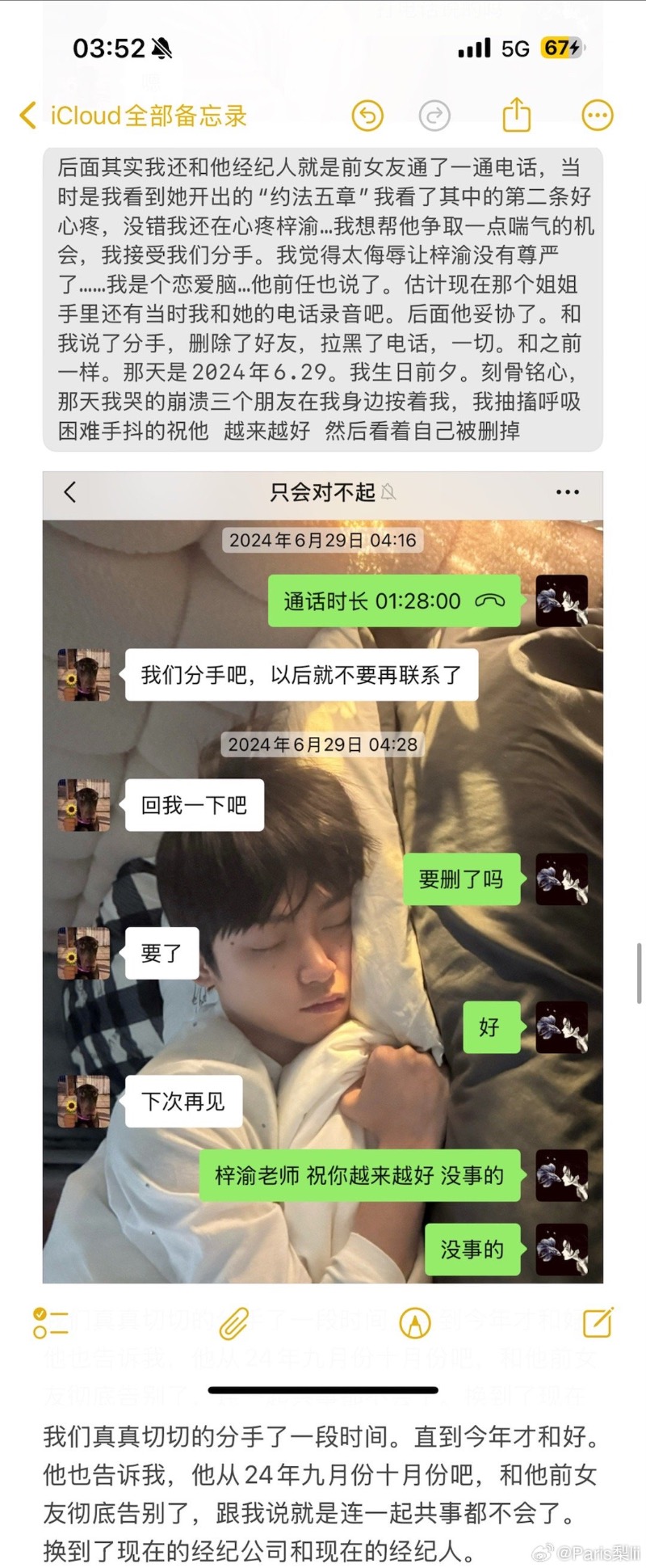 2024年初,梓渝承諾已與經紀人女友分手,與女方復合。但女方發現梓渝仍與經紀人(前女友)共同工作,疑似「工作免打擾、回家切換聯系人」的雙線操作。2024年6月,經紀人以「曝光戀情」逼迫二人分手,梓渝妥協刪除女方。