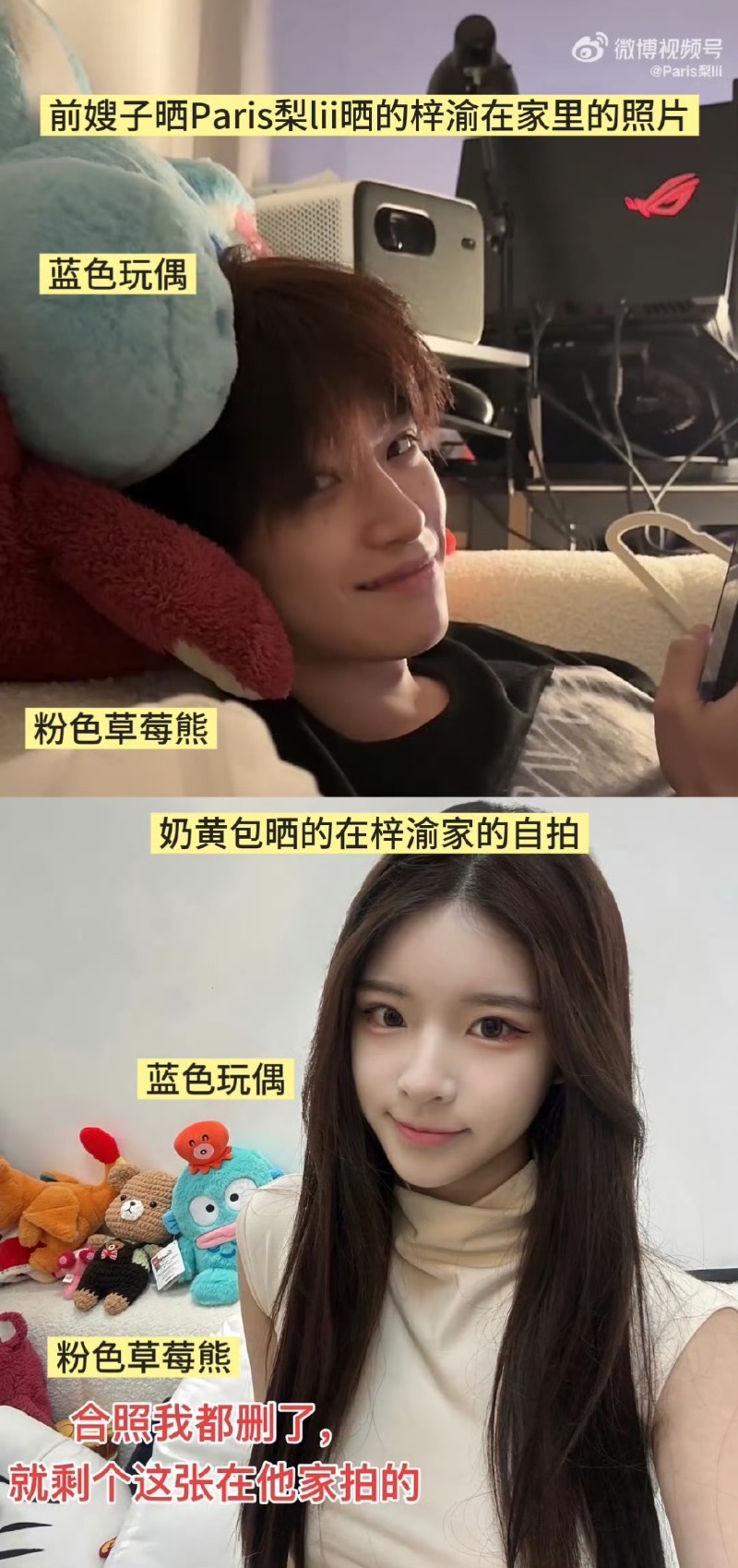 網友發現奶黃包的拍照背景,和第一個爆料嫂子拍的梓渝背景一樣,尤其是玩偶👇