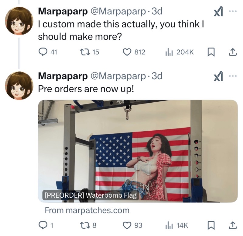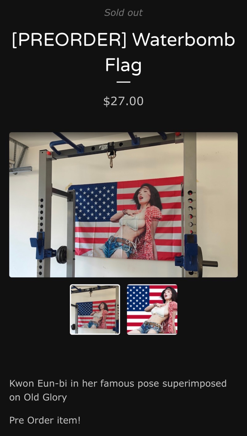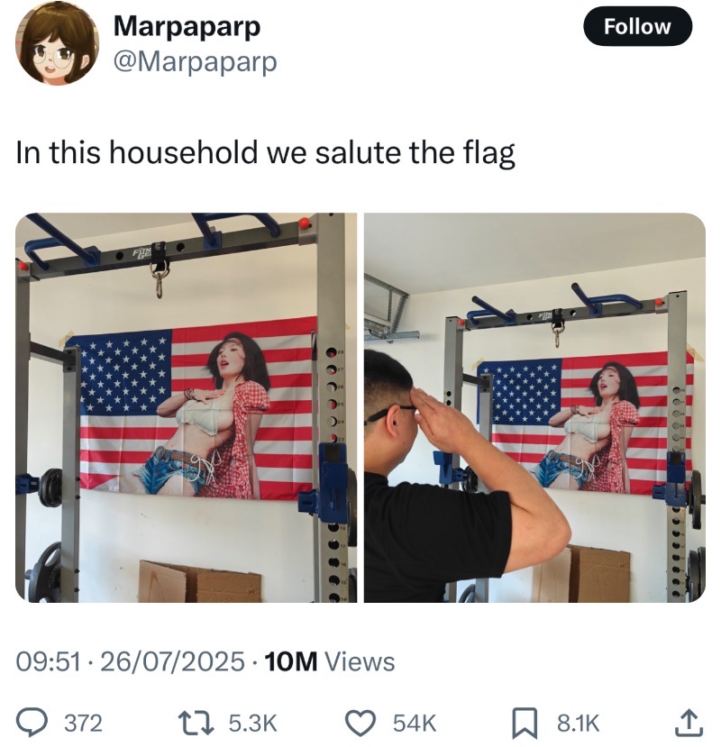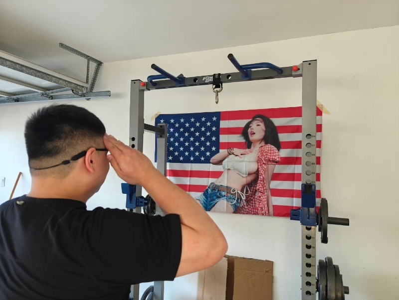 沒想到就有一名在美國的網友,曬出了自己對著印有權恩妃水彈造型的美國掛旗敬禮,表示每天都要對這面旗敬禮👇