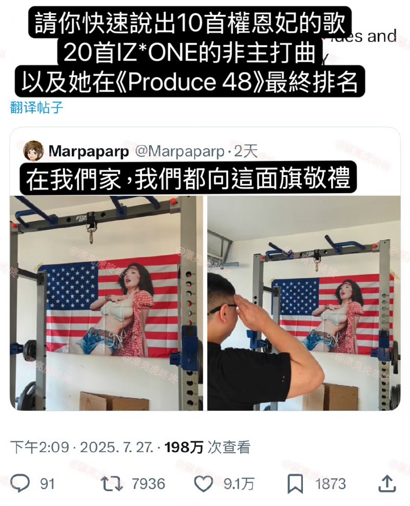 雖然但是,就有權恩妃粉絲轉發這則推文,挑戰這位自稱是男粉的原Po:「請你快速說出10首權恩妃的歌,20首IZ*ONE的非主打曲,以及她在《Produce 48》最終排名。」這則帖文獲得了9.1讚,不少網友都認為,答得出才是真粉絲!