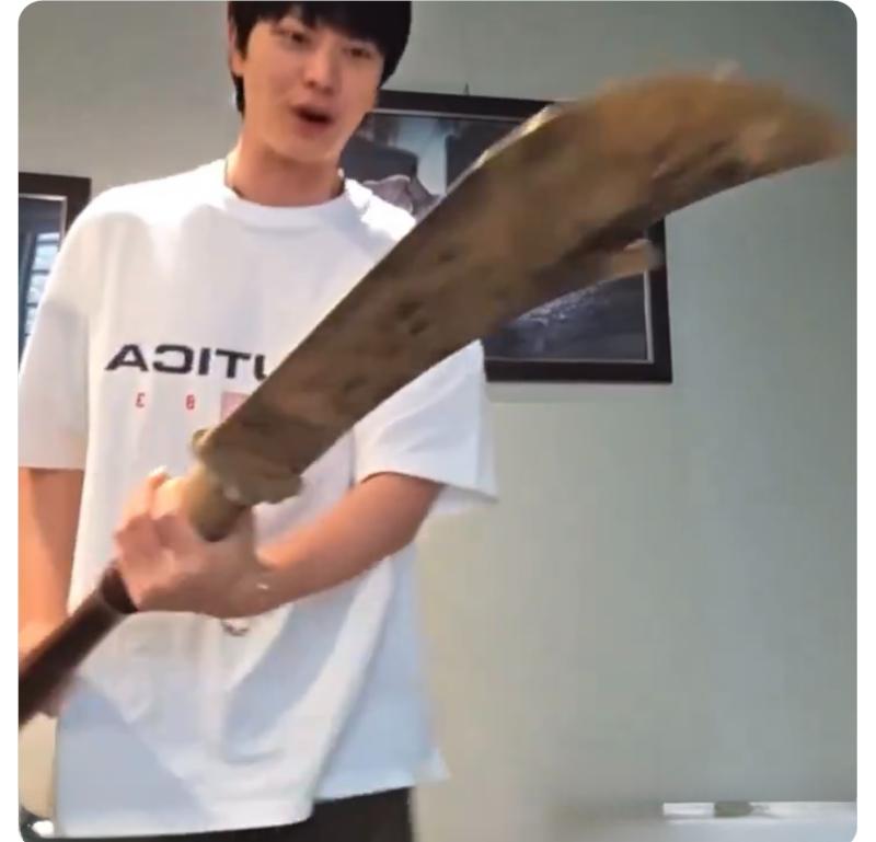 這裡補充說明,這把看起來不太可能出現在普通人家中的大刀,其實是他拍攝《鬼怪》時的道具,拍攝結束之後,劇組直接送了給他,沒想到時隔多年,鬼怪和Labubu意外聯動了!