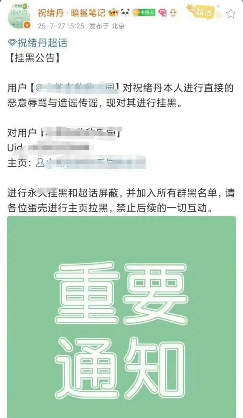 目前,祝緒丹方反黑組迅速挂黑造謠賬號,聲明“惡意辱罵與傳謠者永久屏蔽”,呼籲粉絲拉黑。