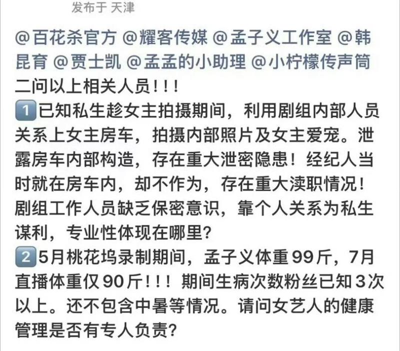 隨後孟子義粉絲發起維權,認為劇組工作人員不應該私自帶私生到藝人的房車,涉及了隱私問題等👇