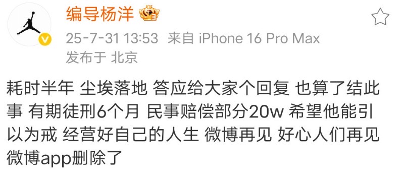 這件事在31號有了進展,車主發文稱李明德被判有期徒刑6個月,同時需承擔民事賠償20萬元。