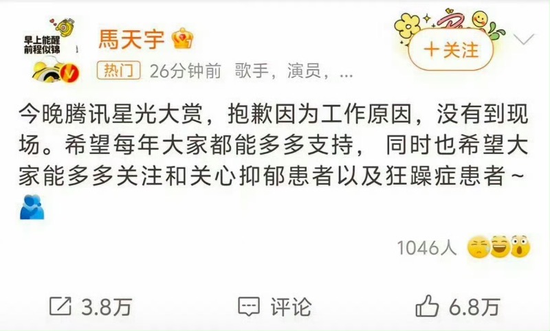 網友再次翻看馬天宇當時發的微博,就是要求網友關心抑鬱患者和狂躁症患者,當時被指內涵李明德,現在才知道原來說的是事實👇