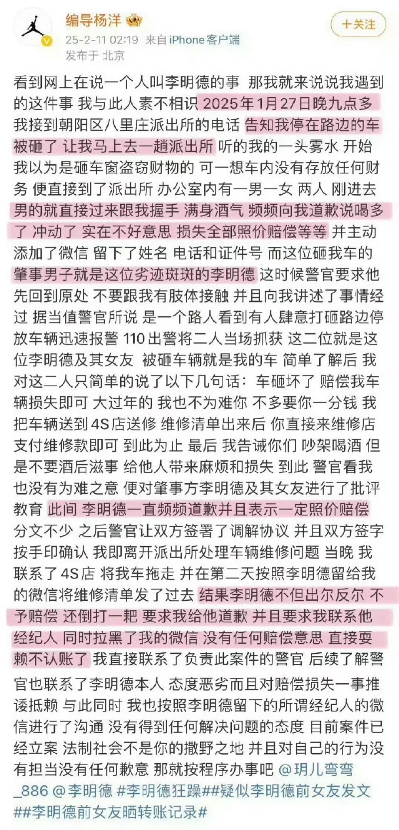 事件源自於1月27日晚,李明德在北京市朝陽區八里莊附近酒後踢踹、損毀這名車主「編劇楊洋」停放在公共車位的車輛,導致車門凹陷、車標脫落、反光鏡損壞等。