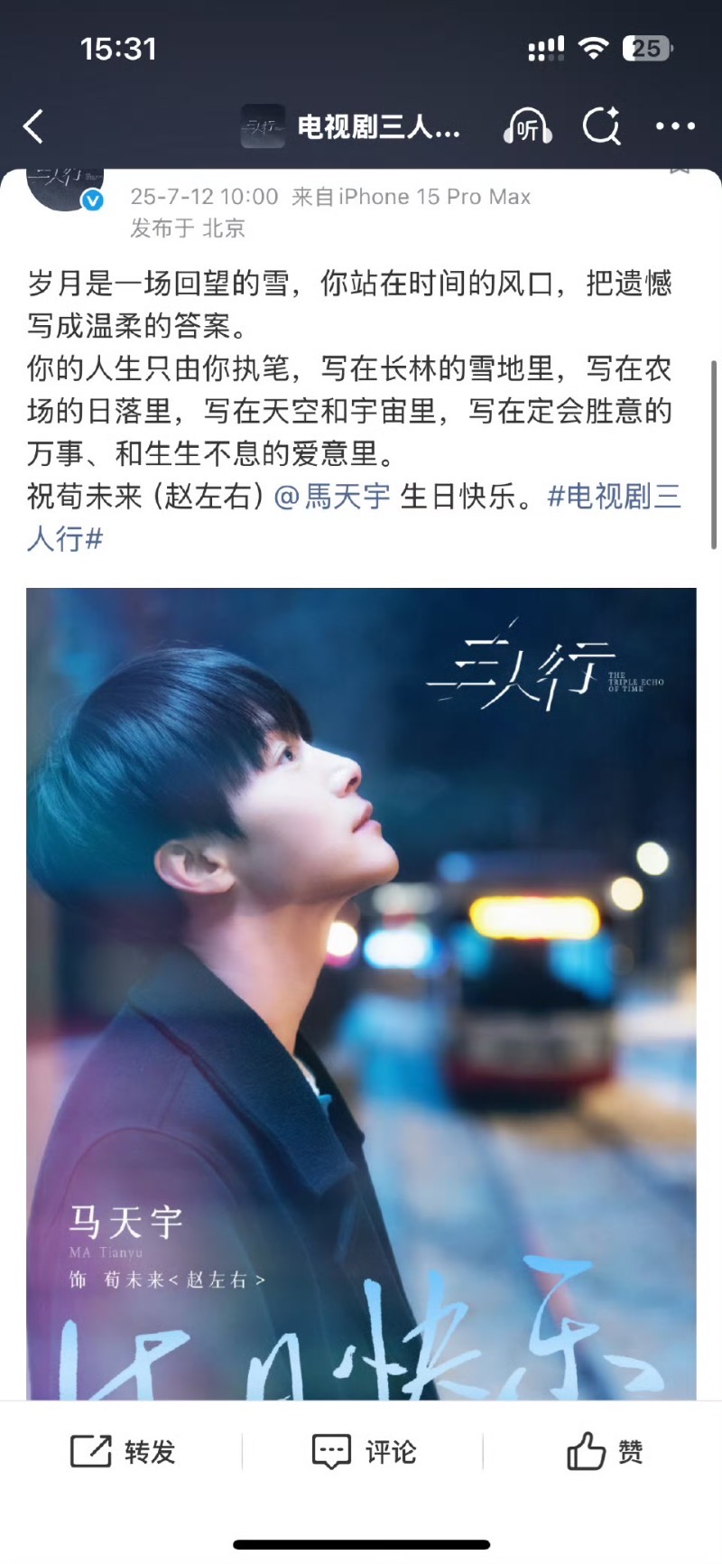 而《三人行》劇組在今年馬天宇生日,送上的祝福也再次被熱議👇