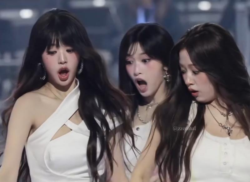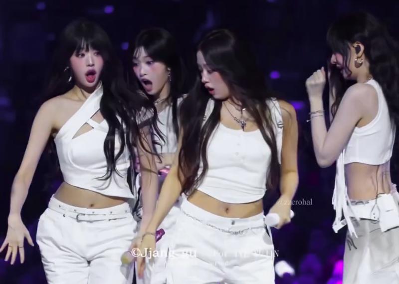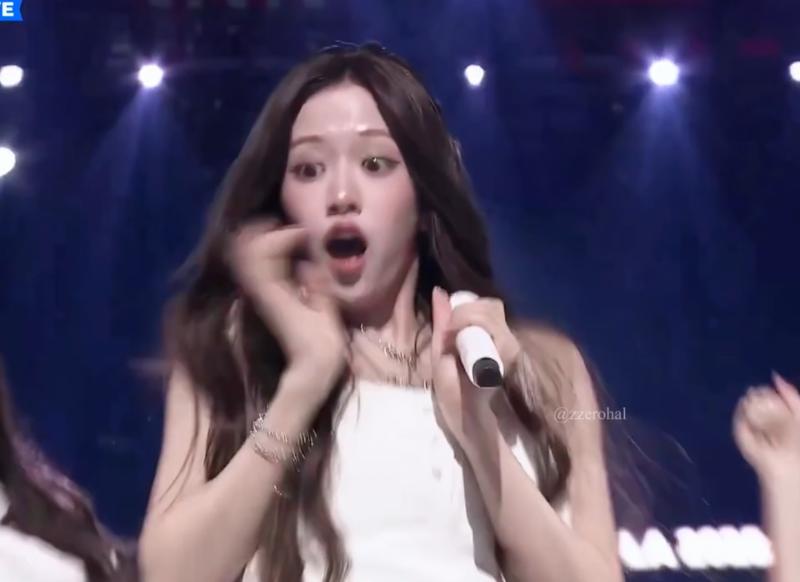 沒想到在舞台上卻發生了小事故,導致成員們集體表情管理失控!原來是Liz的麥克風在表演中,突然上演飛行記,從手中高速滑翔出去!當時主人Liz的表情be like👇