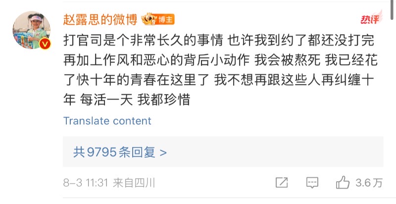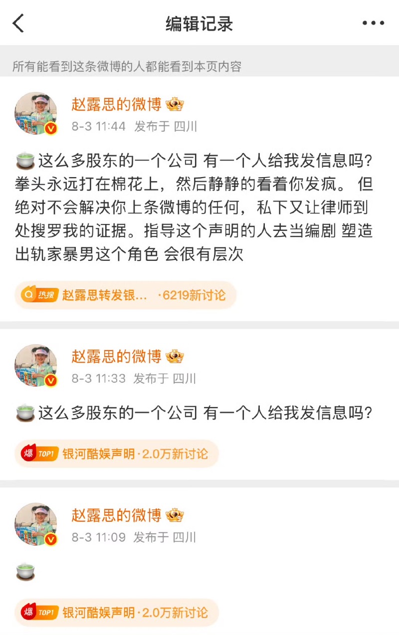 3次編輯文案!趙露思8大問回懟經紀公司!團隊業內傳她裝病! 星聞 By 歐巴是我的 On Aug 3, 2025 Share 媽啊!趙露思好猛!是達,趙露思發長文控訴經紀公司,公司沈默一天後發文回應👇 新聞:合約到2030年+天價違約金!趙露思經紀公司3大重點回應控訴! 隨著公司回應,趙露思第一時間轉發,一開始只配了綠茶🍵表情符號,最後再多次編輯文案如下👇 趙露思也在評論區8問經紀公司,包括在業內傳她裝病、自己吸氧了團隊還去日本滑雪等👇 另外,她也表示做好被起訴的準備,自己不想再跟他們糾纏了👇 圖來源:部分照片取自網路,若侵權請告知 Share