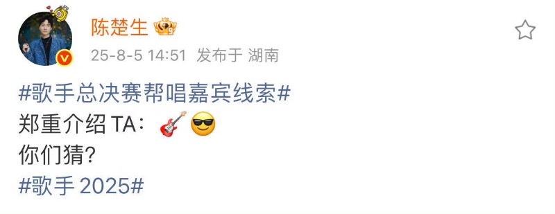 而參賽的歌手們,也在5號這天公布了幫唱嘉賓的線索,先來看看陳楚生👇