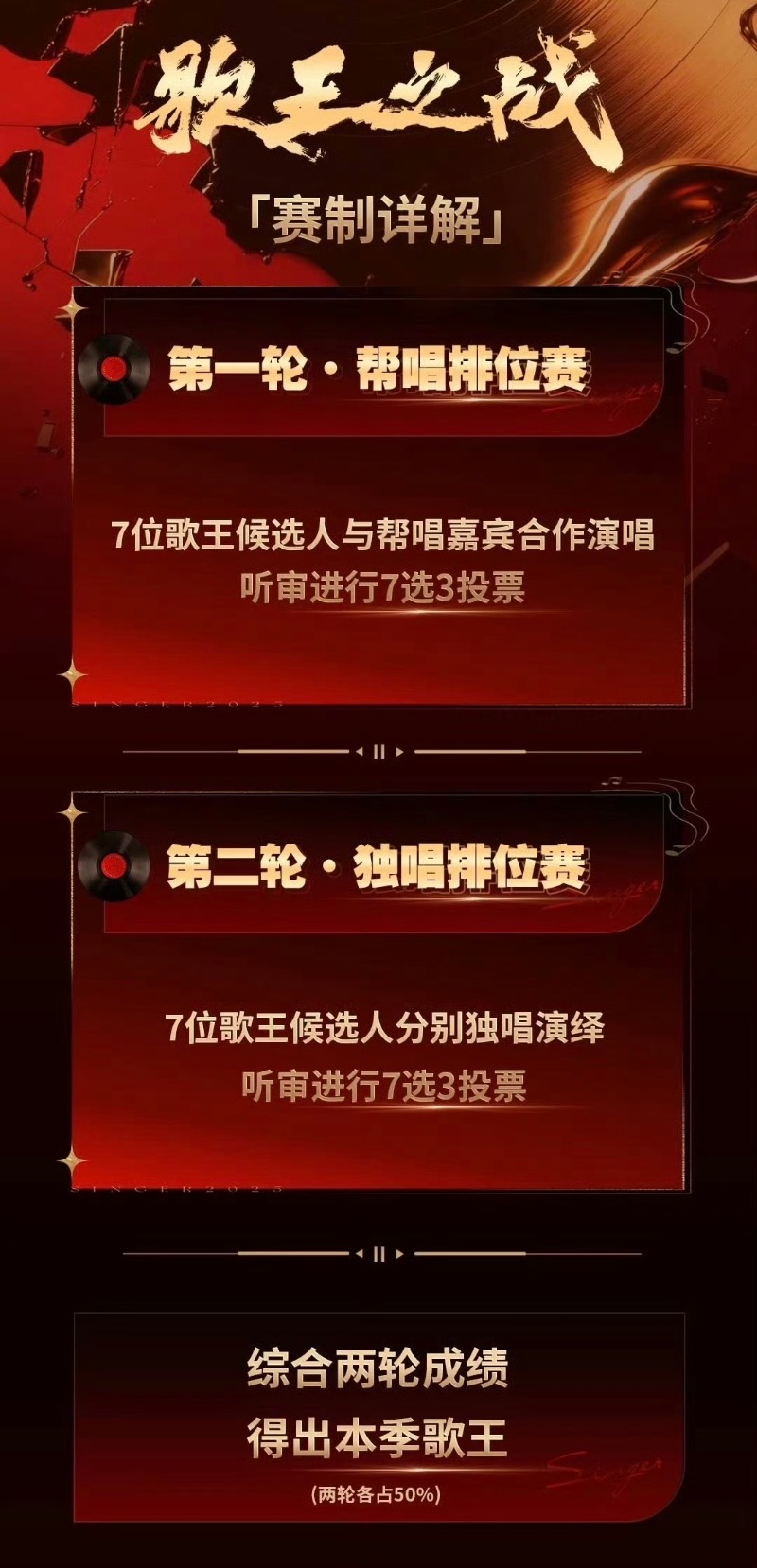 而今年的歌王之戰賽制也正式官宣,分別分成:幫唱和獨唱,兩輪投票都是七選三,綜合兩輪成績產生歌王,兩輪佔比一樣。