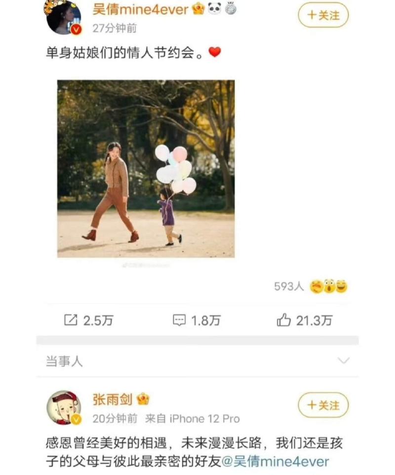 結果才過了一年,兩人就發了離婚聲明,這也是吳倩的名字,第一次出現在張雨劍社交平台裡👇
