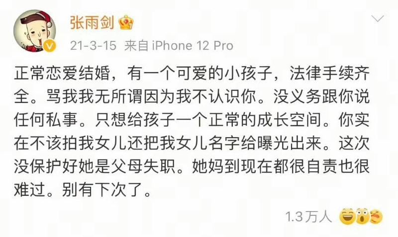 張雨劍才站出來認了孩子,但全篇聲明並沒有提及吳倩,只說了「孩子她媽」,直接被炮轟!