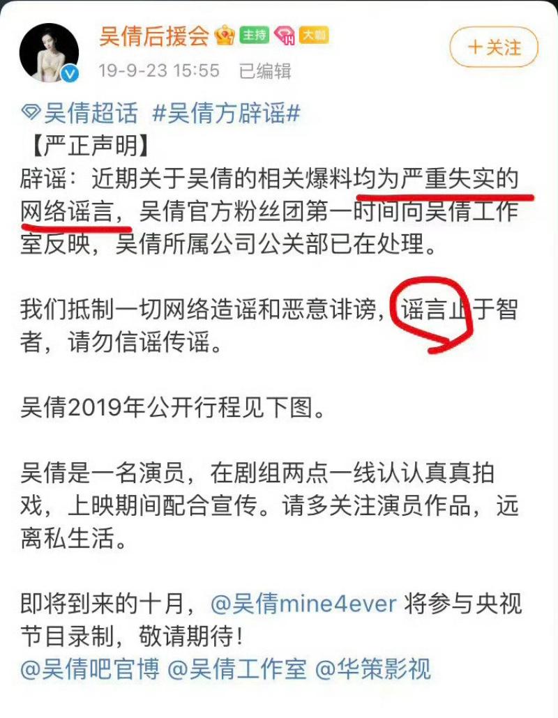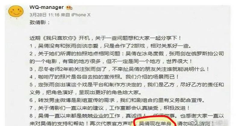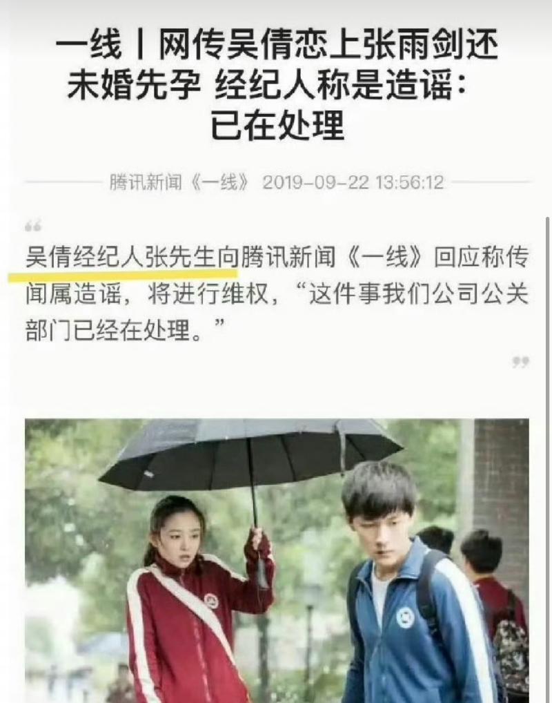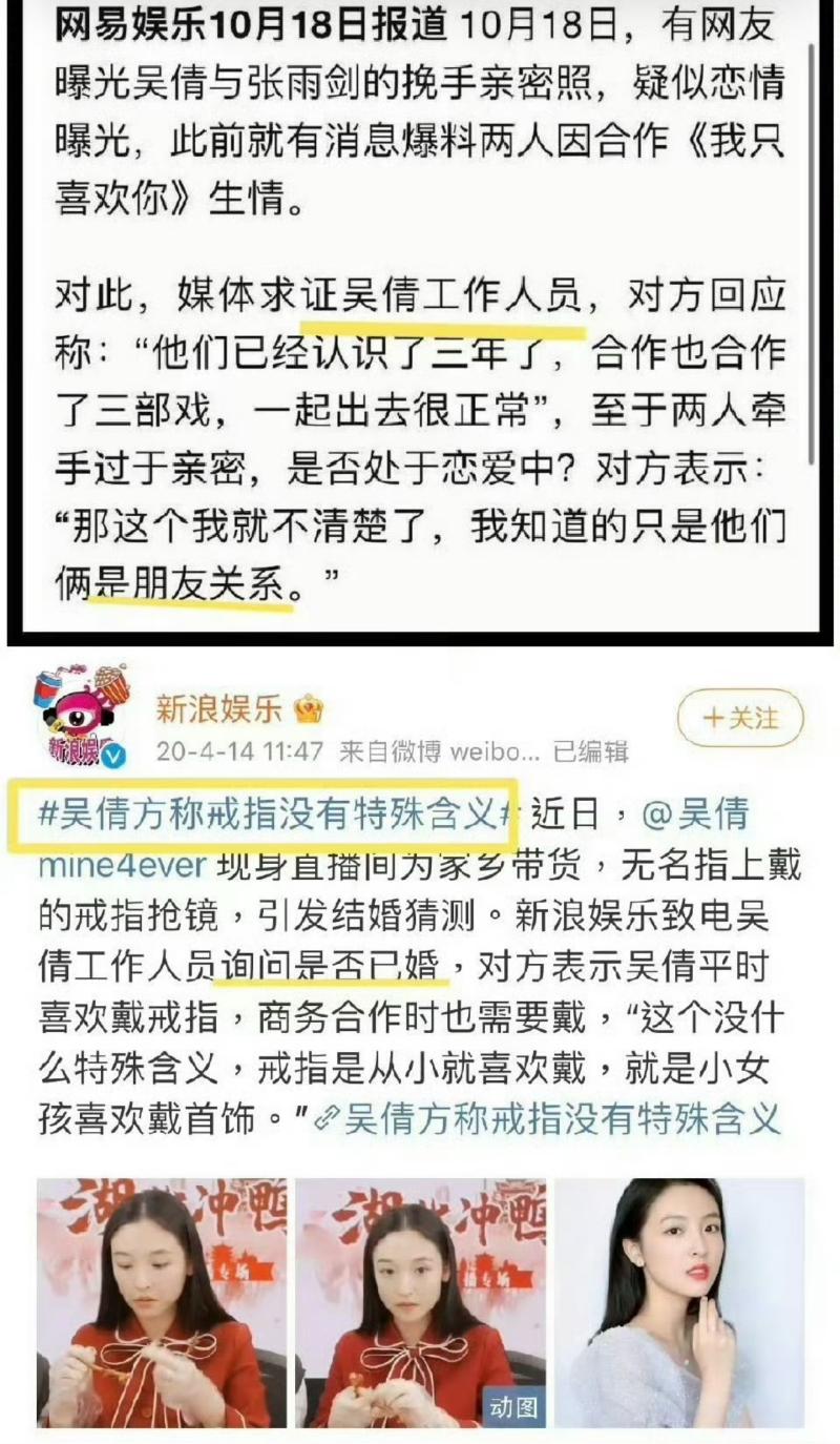 這裡科普一下,吳倩、張雨劍之前一直被傳戀愛,還說吳倩被偶遇產檢,但公司多次出來闢謠👇