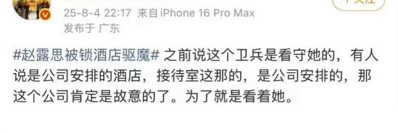 隨著趙露思自曝被關驅魔之後,該博主再發帖表示之前就說過了這衛兵有問題,粉絲當時說是公司安排的酒店,這就可以肯定公司是故意擺設的了!