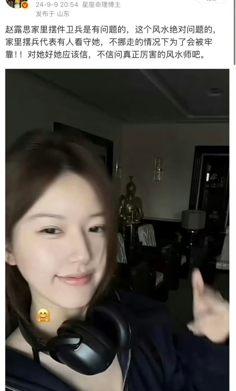 這則貼文由某命理博主發出,當時他就警告趙露思,表示她住所中的擺件很有問題,在家中擺「衛兵」表示有人看守她👇