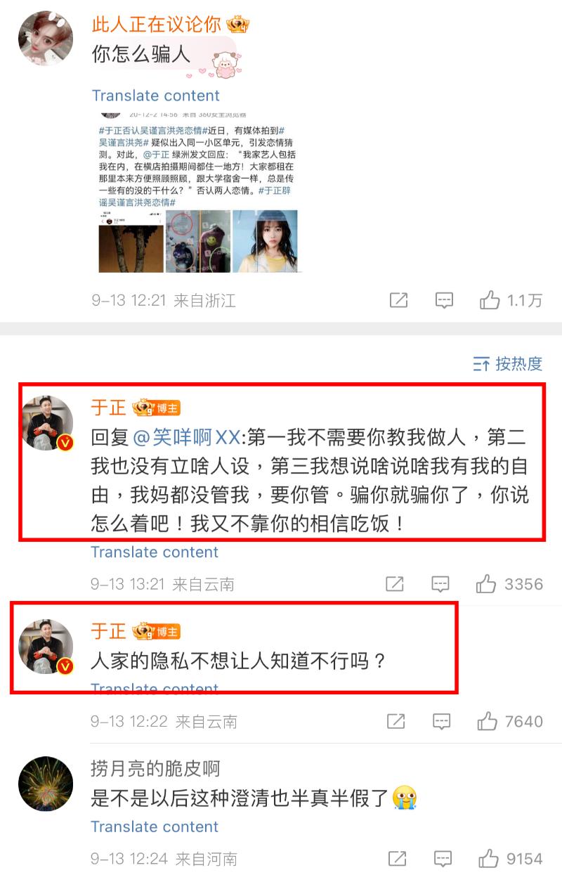 在婚訊公開之後,吳謹言老闆于正第一個被網友炮轟,因為他之前曾多次否認兩人戀情,但于正也回懟得十分理直氣壯!