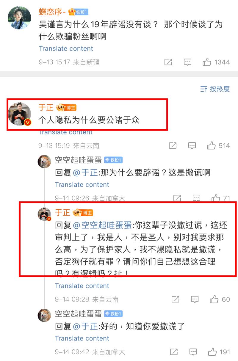 在婚訊公開之後,吳謹言老闆于正第一個被網友炮轟,因為他之前曾多次否認兩人戀情,但于正也回懟得十分理直氣壯!