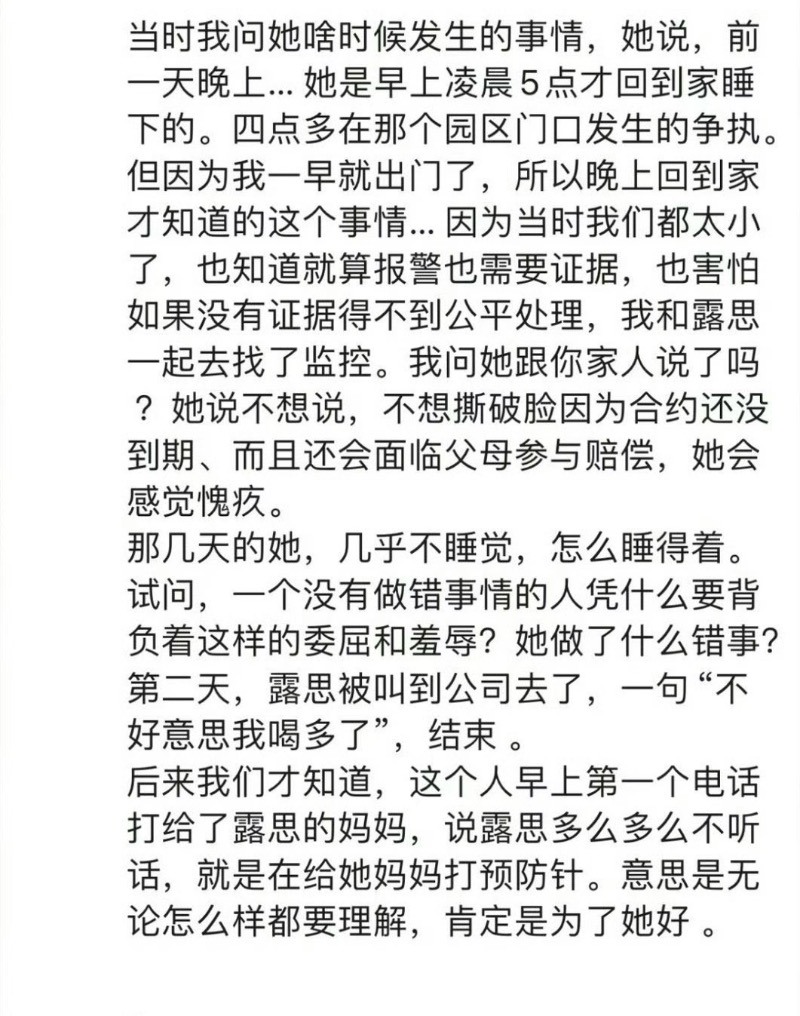 這裡科普一下,去年12月底趙露思還有曾發長文,指控趙露思2019年在北京試戲時,因為沒試上女一號被公司毆打,還被叫到廁所進行辱罵,她經常夢見嚇醒。
