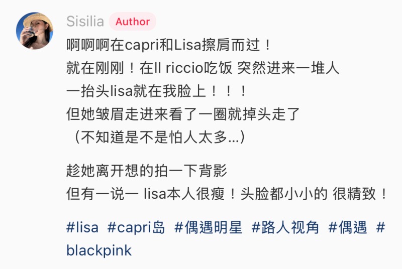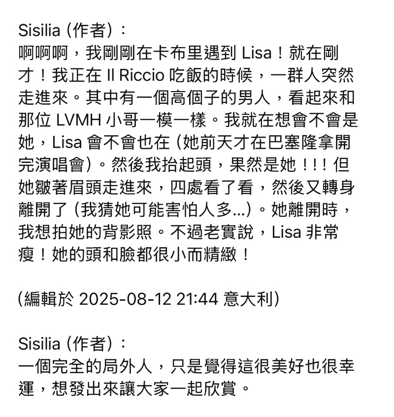沒想到近日忙著海外世巡的Lisa,又又被網友偶遇了!有IP在意大利的網友發文,分享了一段自己拍攝的Lisa,表示在意大利卡普里岛偶遇Lisa!