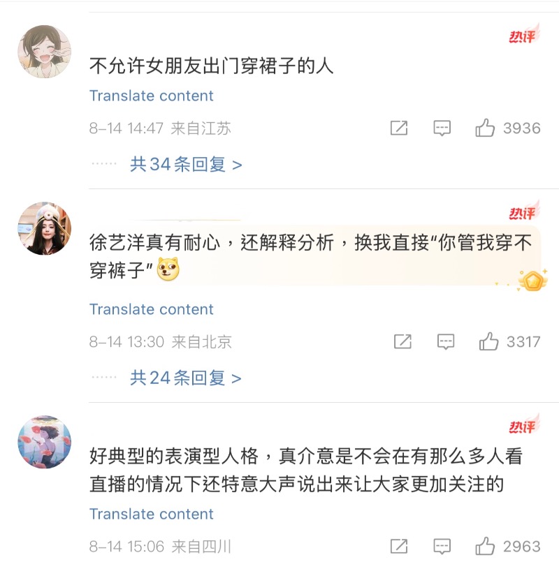 徐藝洋耐心回應表示:「穿了裡面有打底褲」,黃子韜不依不饒強調:「那你也不能露腿」「我不喜歡你露腿」。徐藝洋當即反駁:「是你的角度問題。」最後,黃子韬還說出:「腿只能露給我一個人看,防著家人們是不是」。