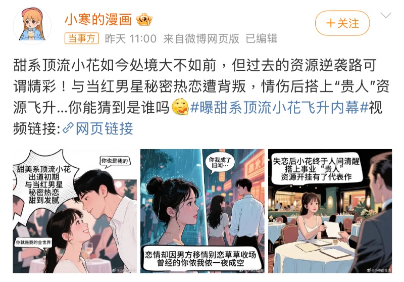 啊咧~張小寒漫畫又來了!是噠,如果關注內娛的話,應該知道狗仔張小寒曾曝光過不少娛樂圈秘聞,當中她最出圈的,就是以漫畫方式爆八卦,而最新的這個則分享了「頂流小花」的飛升內幕👇