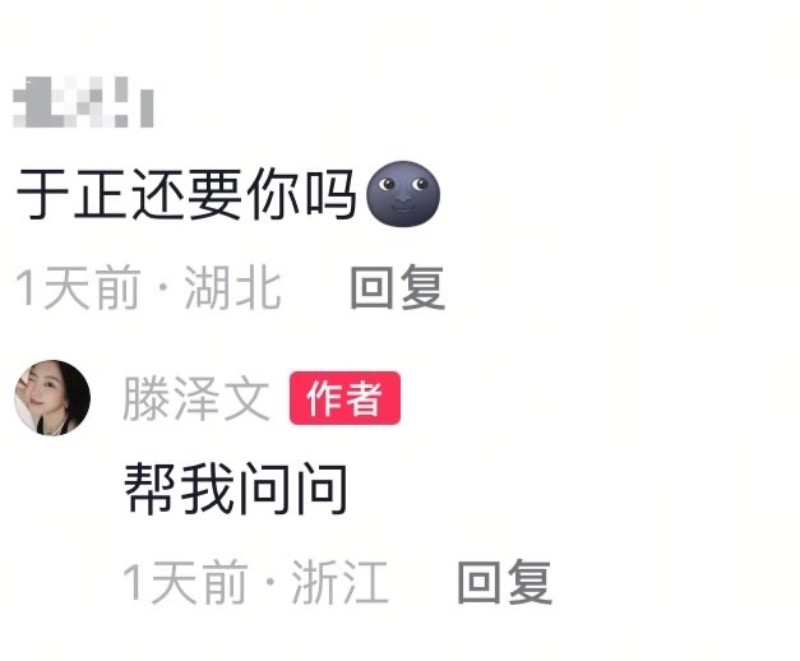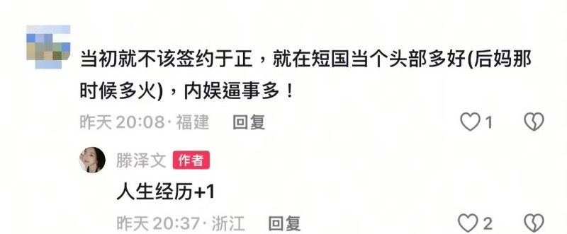 當時老闆于正兩次回應指責滕澤文未報備蹭熱度,表示要勸退她。此後,滕澤文便疑似被雪藏,片酬驟降,粉絲流失。