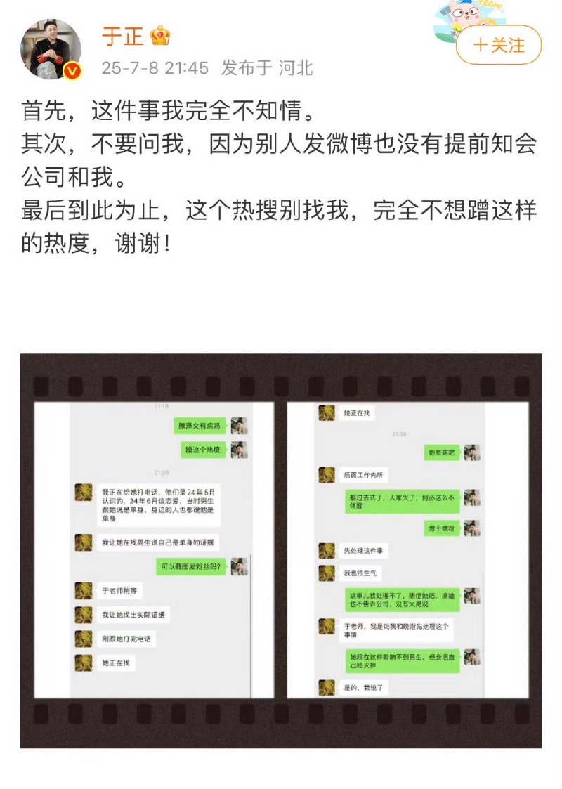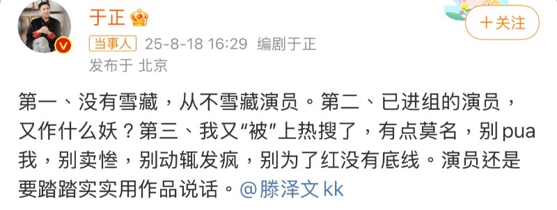 隨著熱議,于正發文回應,表示:「第一、沒有雪藏,從不雪藏演員。第二、已進組的演員,又作什麼妖?第三、我又「被」上熱搜了,有點莫名,別pua我,別賣慘,別動輒發瘋,別為了紅沒有底線。演員還是要踏實實用作品」。