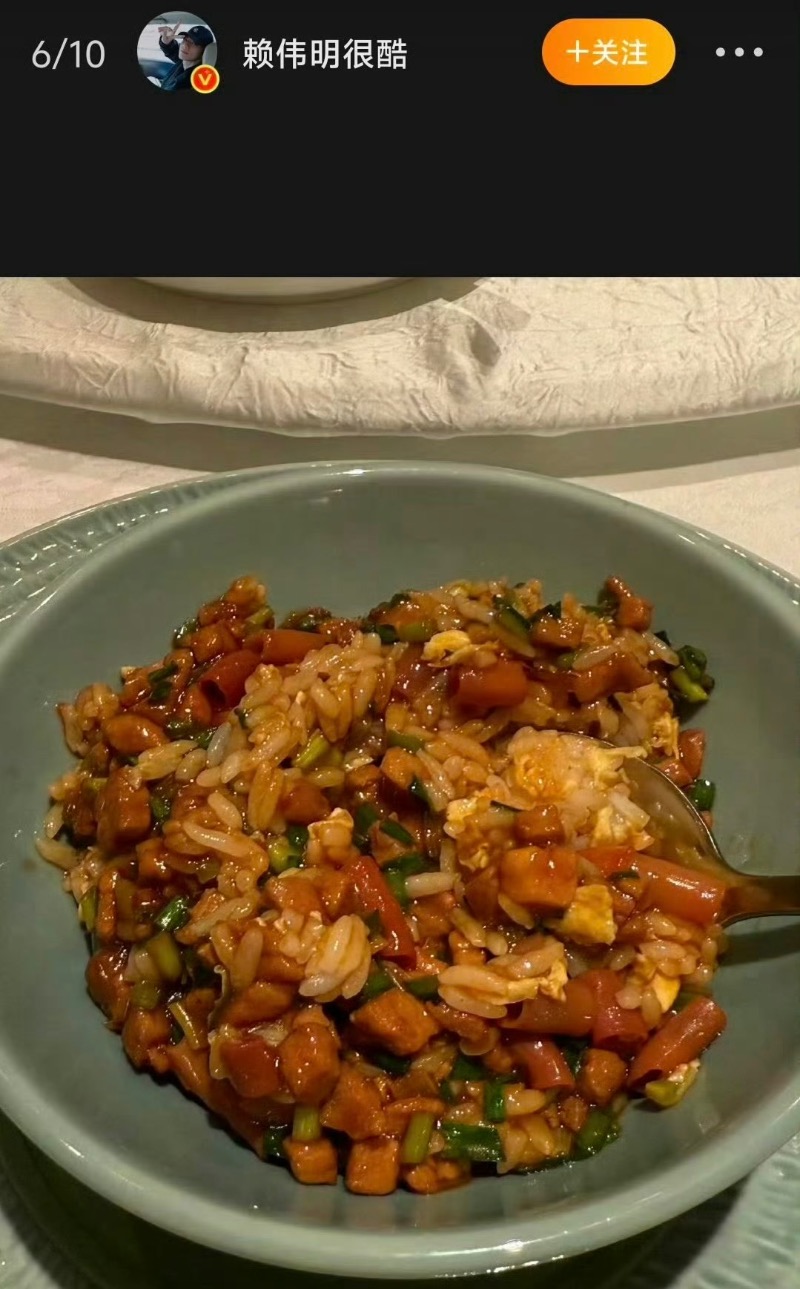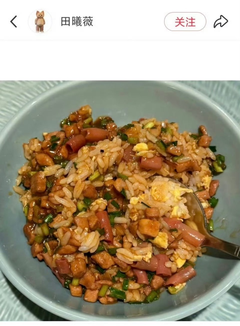 沒想到傳完胡一天,這下輪到了女主田曦薇?是噠,有網友發現,田曦薇之前曬出的炒飯,和同劇男二賴偉明曬的一模一樣👇