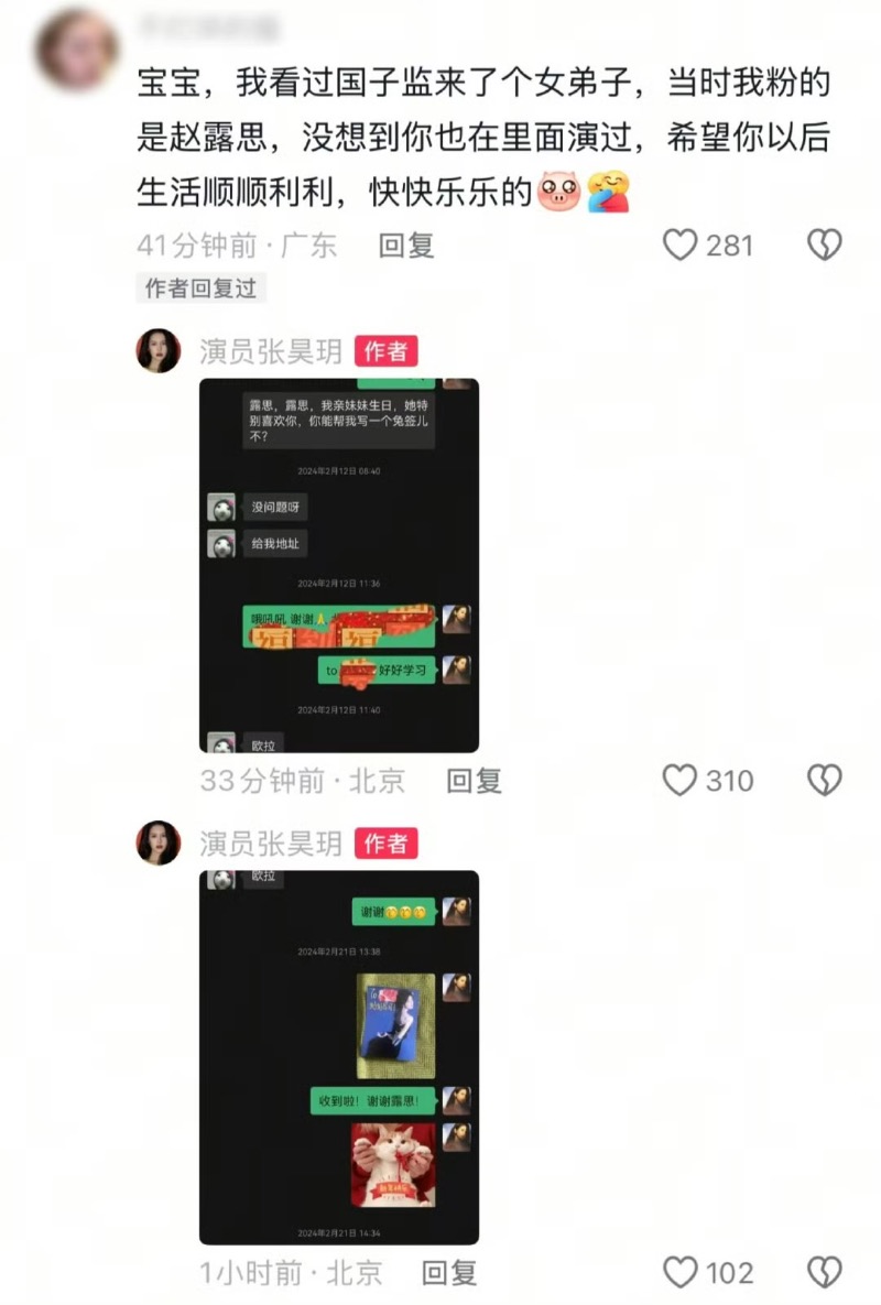 沒想到現在連圈內人也下場了!是噠,演過《國子監來了個女弟子》的張昊玥,在粉絲留言鼓勵她的時候,分享了趙露思給她妹妹簽名照當生日禮物的小故事。