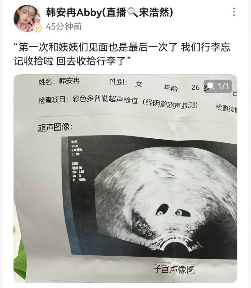 沒想到在20號的直播中,韓安冉自曝三胎已經流產,因為孩子狀況不好,所以兩個都保不住!當中她提到很可能是孕前整容打了麻醉,所以才導致這種情況發生!還在社交平台貼出了超音波照告別👇