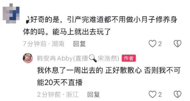 對於一引產就能出國玩,韓安冉表示自己休息了一周才出去的~