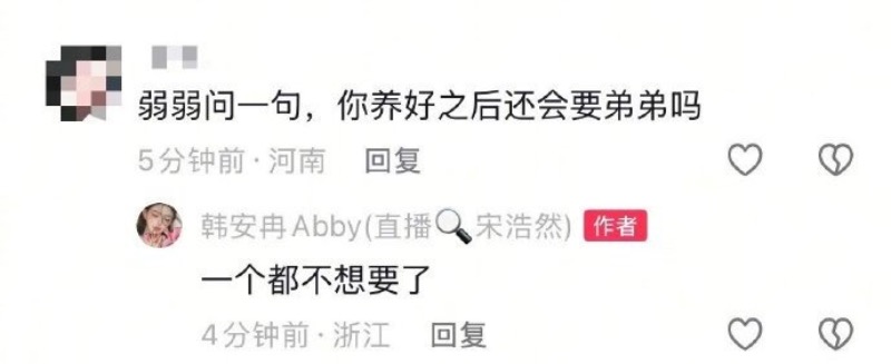 對於網友質疑會不會再想生兒子,韓安冉表示自己不會再生了👇