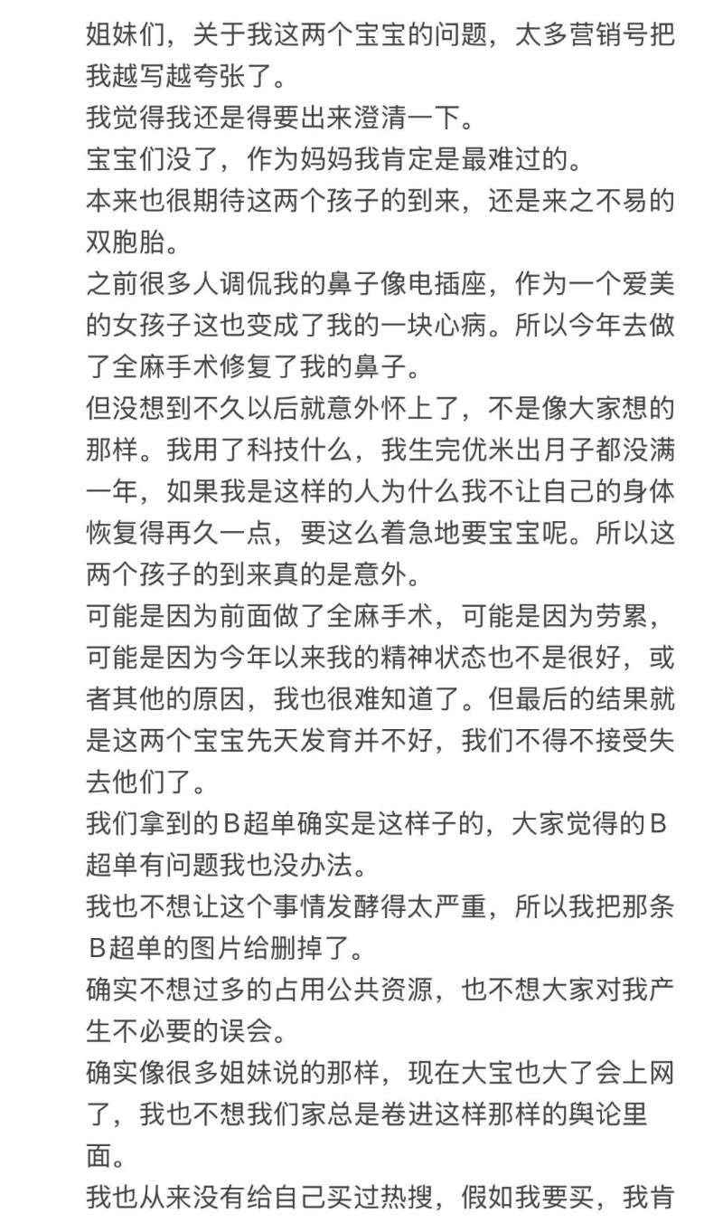 隨著上了熱搜第一,韓安冉刪除了超音波照片和視頻,再發長文回應,表示自己確實是引產了,原因未知,但真的不是故意在懷孕前去整容打麻醉,也沒有想用這個來引流帶貨等,身為媽媽,寶寶沒了自己肯定是最難過的,全文如下: