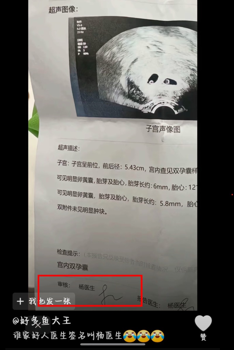 包括她曬出的超音波照,上面的醫生居然沒有完整名字,只有「楊醫生」,被質疑是造假圖👇